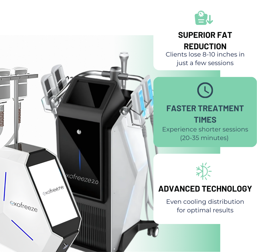 The Exofreeze stands out with its advanced technology, delivering superior results in faster treatment times. Its innovative design prioritizes client comfort and ease of use for staff. We encourage you to visit our Exofreeze product page to learn more about the specific advantages it offers.