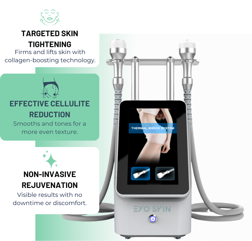 The ExoSkin is a cutting-edge thermal shock system designed to tighten, tone, and rejuvenate the skin. By alternating between hot and cold therapy, it stimulates collagen production, reduces cellulite, and enhances skin elasticity—delivering visible results with no downtime.